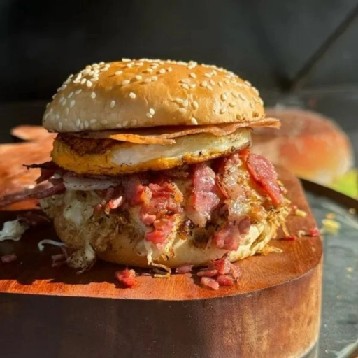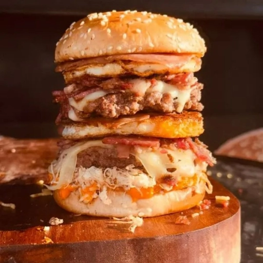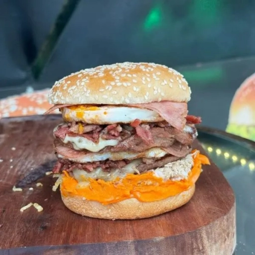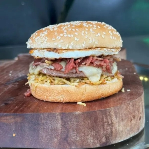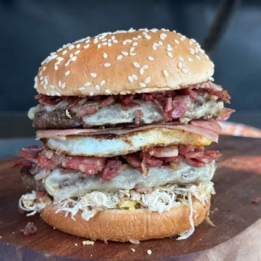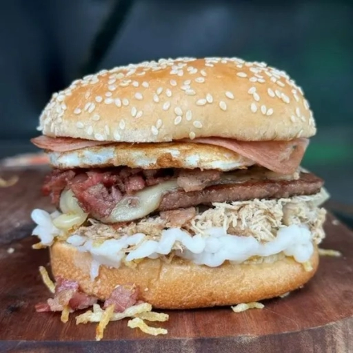 Pão, 2 Carnes, 2 Fatias De Muçarela, Bacon, 2 Ovos, 2 Fatias de Presunto, Frango, Catupiry, Cheddar, Batata Palha, Sal... Ver completo