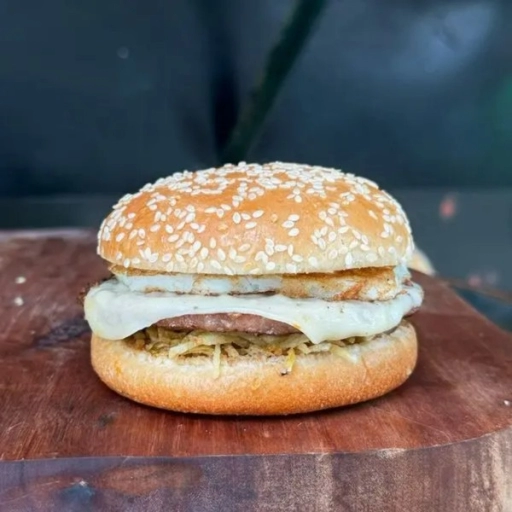 Pão, carne, muçarela, Ovo, Batata Palha, Salada