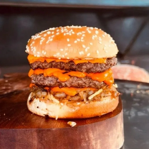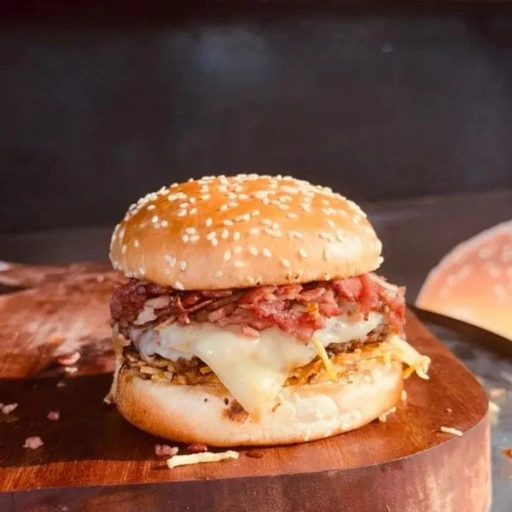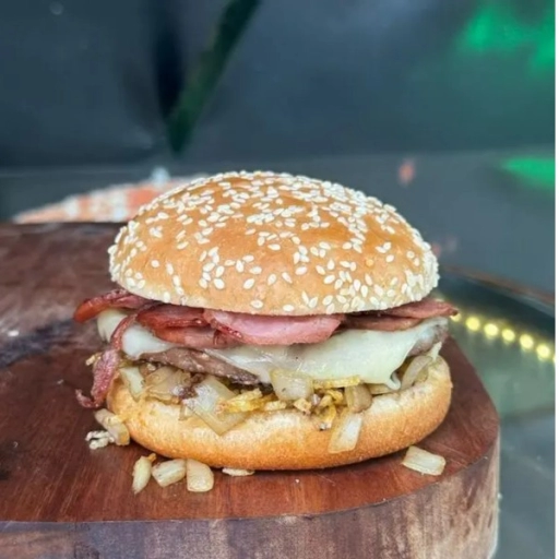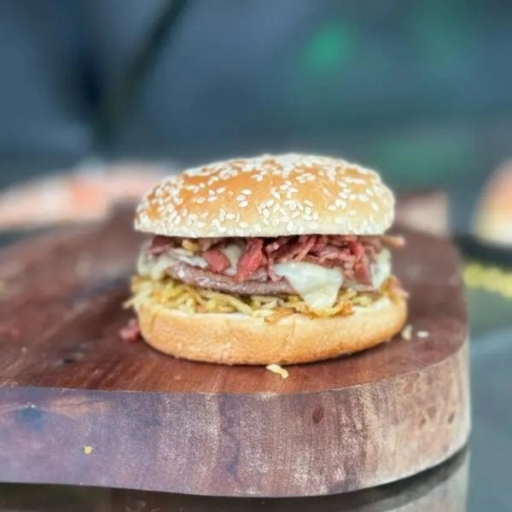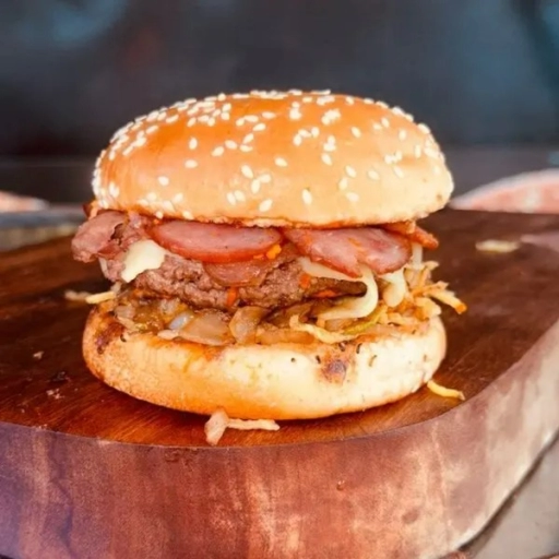 Pão, Carne, Muçarela, Calabresa, Cebola Caramelizada, Batata Palha, Salada